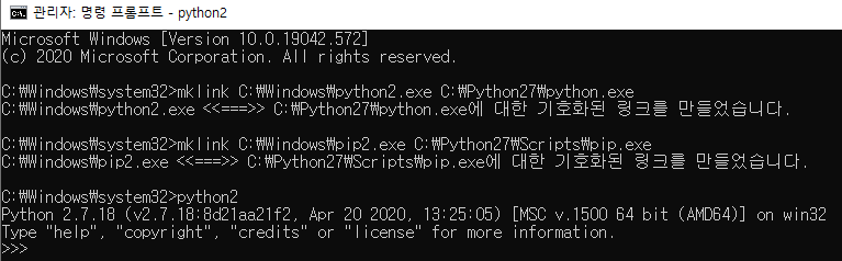 그 이후 심볼릭링크로 python2를 cmd에서 쳤을 시 python2.7이 열리게 세팅